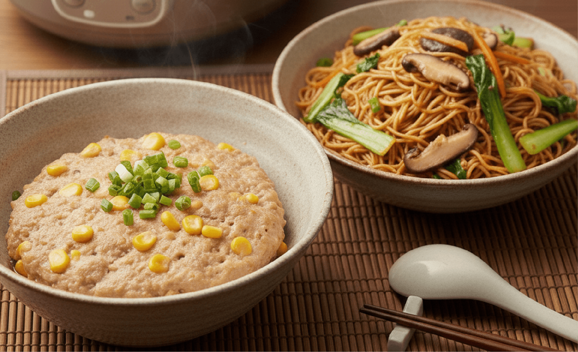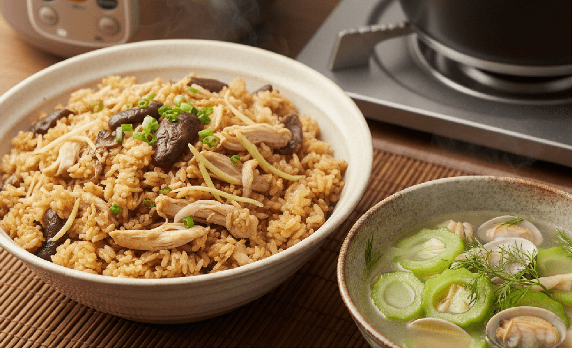 - 炊飯:去骨雞腿肉 2 塊、鮮香菇 5 朵、紅蘿蔔半根、白米 2 杯、昆布醬油 2 匙、味醂 1 匙。
