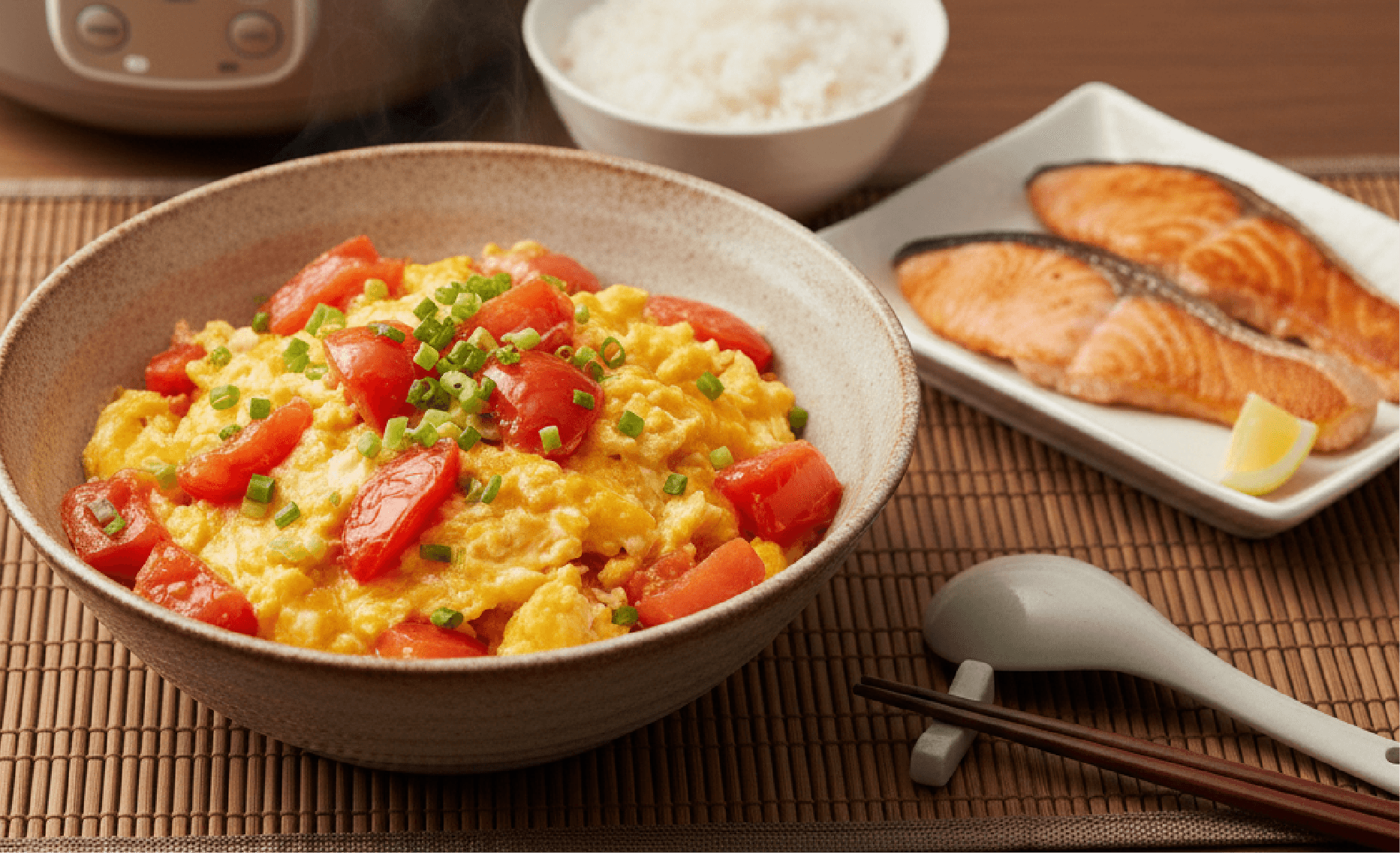 - 番茄炒蛋:原鍋(留有鮭魚油,富含 Omega-3)放入切塊番茄炒至出汁變軟。倒入預先打散的蛋液,先不要翻動,待底部凝固後再快速拌炒。加入一小匙糖與番茄醬提味。